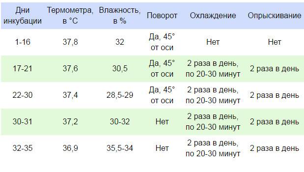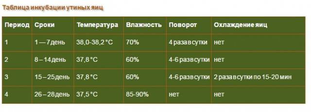 Доњу табелу можете користити као упутства за постављање режима за сваку од недеља инкубације паткиних јаја.