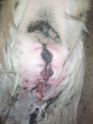 Покушаји се уклањају, слузница се третира и дезинфикује.Отпао део се враћа уназад и вулва се зашива. После недељу и по, фиксација се уклања. Лечити вагинитис.
