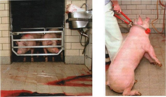 У погонима за паковање меса свиње се кољу на два начина. Прва технологија је употреба високотехнолошких шокера након чега следи клање. Специјалне омамљујуће пушке могу омамити до 100 глава на сат. Накнадна обрада састоји се од вешања трупа и сечења врата. Труп без крви се преноси на даље сечење. Ова метода није хумана, али вам омогућава да постигнете идеалан квалитет меса за крајњег потрошача.