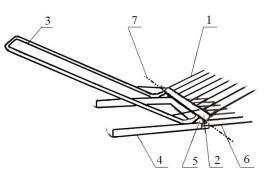 - За производњу радних вилица, означених бројем 4, узмите комад квадратне цеви. Комад округле цеви пречника 50 мм заварен је у средини за дрвену дршку. Радне виљушке су покретни елемент, стога су причвршћене за заједнички оквир носачем означеним бројем 5. Повезна јединица састоји се од два дела: један је заварен на оквир, а други на ручку за дршку. За производњу носача користи се челични лим дебљине око 5 мм. Два елемента су повезана обичним вијком, али немојте чврсто затегнути да би се радне виљушке могле померати.
