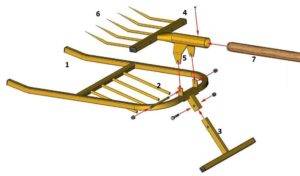 Теже је направити чудотворну лопату „уради сам“ од два сегмента. Али такав алат је ефикаснији и лакши за рад са њима. Конструкција се може заварити према шеми Орача или Кртице. Ово је лична преференција власника. Сви главни делови лопате су представљени и нумерисани испод на фотографији. Вођени овим дијаграмом, погледаћемо како направити чудотворни алат код куће: