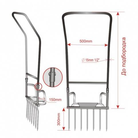 Фотографија приказује цртеж чудотворне лопате с властитим рукама из једног сегмента. Алат се састоји од радне виле.Ефикасност и лакоћа рада зависе од удаљености граничника. Што је дуже, теже ће бити копати земљу. Међутим, корак унапред зависи од дужине заустављања. Оптималном величином се сматра заустављање дужине 15–20 цм, али све зависи од физичког стања радника.