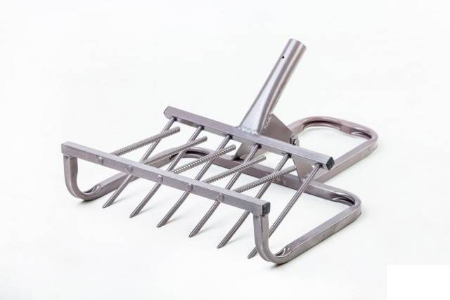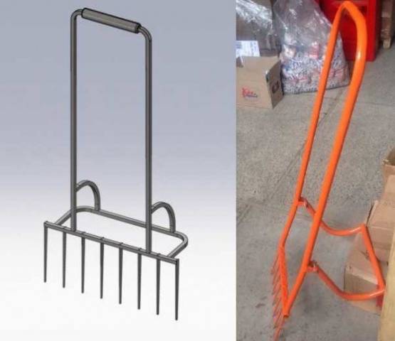 - За израду клинова радних виљушки, означених бројем 6, узимају се каљене челичне шипке. Један крај зуба је наоштрен под углом од 30О томе, а друга ивица је заварена на квадратну цев са прикључном покретном јединицом. За боље растресање тла, клинови су савијени под углом од око 150О томе... Зуби других стационарних виљушки направљени су од арматуре. Нема потребе за оштрењем ивица. Затичи су заварени на попречни носач главног оквира. Зуби радних виљушака треба да буду још 1. Растојање између затича зависи од ширине оквира, али не мање од 100 мм.
