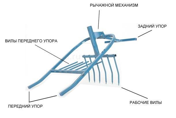 - Када се зуби потпуно забију у земљу, дршка лопате се повлачи уназад. Кроз везу, радне виљушке подижу слој тла, гурајући га кроз зубе непокретног горњег граничника. У овом тренутку, земљиште је опуштено.