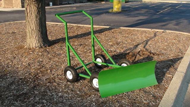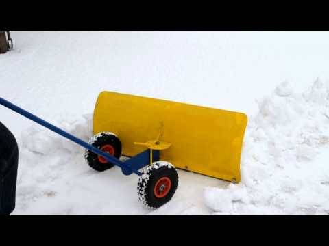 Производња ручних булдожера за орање снега основана је у производњи, али није тешко сами их саставити. Потребно је само исећи полукружни сегмент из цеви великог пречника. Ово ће бити рупа. Да би га спречио да огребе плочице за поплочавање, меки нож од густе гуме може се одоздо причврстити вијцима. Готова лопата је причвршћена за оквир точкова колица за бебе, ручка је подешена и снежни плуг је спреман.