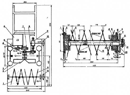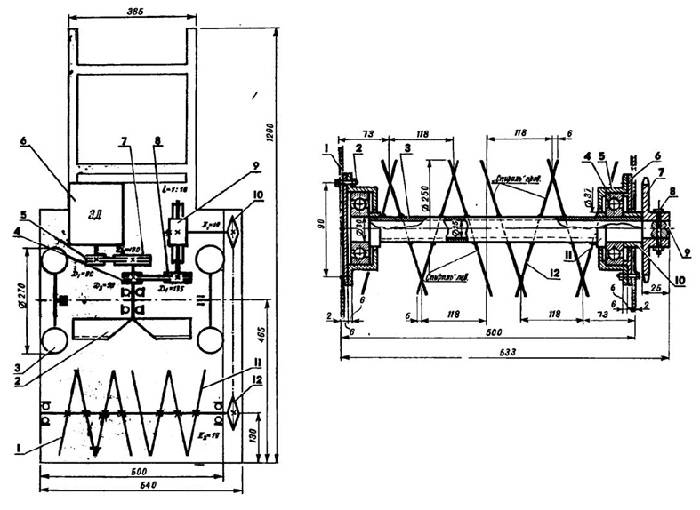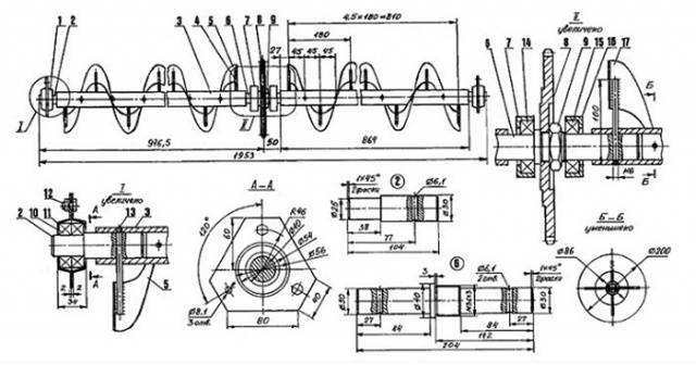 Најтежи део за производњу је пуж. Лакше га је наћи готовог од старе пољопривредне опреме.У супротном, мораћете да обавите окретање и заваривање. Вијак се саставља према приказаном цртежу. Прво узмите комад цеви пречника 20-25 мм. Игле су причвршћене на оба краја. Ножеви су направљени од челичног лима дебљине 2 мм. Да бисте то урадили, исеците 8 половина дискова. Заварени су на цев тако да се добије двострана спирала. У средишту ротора између две спирале заварене су металне лопатице.