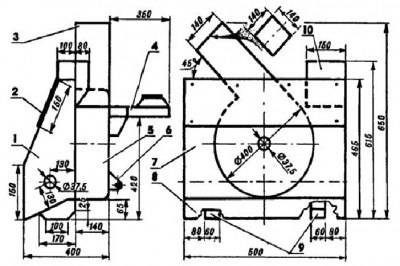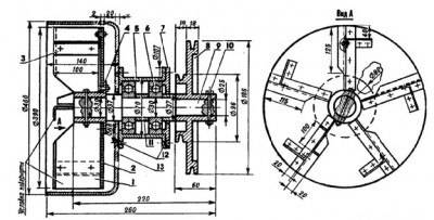 Према представљеним цртежима, можете направити вентилатор за снег. Прво је овално тело заварено од челичног лима. Овај облик је неопходан за усисавање снега од стране вентилатора. У отвор на задњем делу кућишта уграђена је чаура лежаја. У снежној фрези биће их 4. Два лежаја се гурају на осовину, а затим убацују у чауру. Један крај осовине треба да вири изван кућишта. Овде су постављена још два лежаја са стаклом на која су заварени монтажни носачи. Крај осовине такође треба да вири са ове стране.