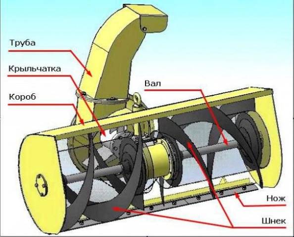 Да бисте направили ротациони чистач снега од култиватора, потребно је да обавите пуно окретања и заваривања. Таква шарка се назива и пуж. Механизам се састоји од челичног кућишта. Унутрашњост се окреће на лежајевима. Ножеви у облику спирале хватају снег и гурају га са бочних страна тела према централном делу. У овом тренутку на ротору, металне лопатице се окрећу. Они покупе снег и истисну га кроз млазницу постављену на тело снега. Правац поласка регулише се визиром. За то се чаура ставља на излаз млазнице. На врху је постављен окретни визир. Сам оператер га окреће у правом смеру.