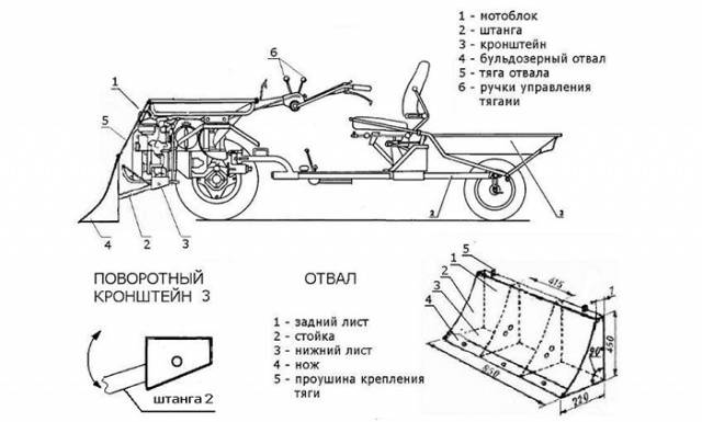 На задњој страни лопате, на врху су заварене 2 ока, а шипке су причвршћене за њих, идући до управљачких полуга. Очи су такође заварене у средини оштрице. Овде је причвршћена шипка помоћу које је спона фиксирана на носач на оквиру култиватора. Монтажа булдожера је завршена, можете покушати да веслате снег.