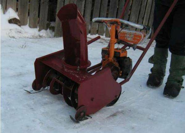 У производњи овог прикључка прво се састави ротациони чистач снега. Излазна млазница на телу је заварена великим пречником. Поред тога, са стране је причвршћен прстен у који је уметнут ротор са лопатицама вентилатора. На врх млазнице ставља се чаура са окретним визиром. Ротација вентилатора и пужа је организована од мотора култиватора кроз ременски погон. Можда ћете морати да поставите ременице са три нити на осовине.