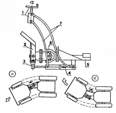 За ломљење, управљач је погодан из било ког путничког аутомобила. Али како би се повећала окретност опреме, препоручљиво је инсталирати хидраулику. То ће олакшати управљање трактором. Цео систем је уклоњен из старе пољопривредне опреме. Такође вам је потребна пумпа за уље, коју покреће мотор. Оптимално је осигурати да се точковима главне осовине управља преко мењача. На фотографији предлажемо да видимо цртеже главних управљачких јединица.