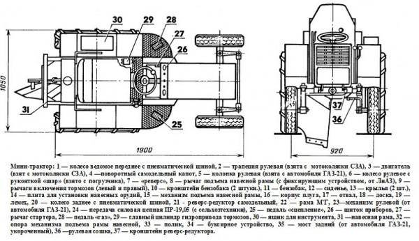 Власници производе такве домаће производе од старих делова из аутомобила или преправљају мотокултиватор. Постоји много опција, а сваки дизајн је индивидуалан. У сваком случају, ако ћете преклопити мини-трактор, онда не можете без цртежа. На дијаграму обавезно назначите димензије оквира, локацију свих чворова и друге детаље. На фотографији предлажемо да видимо од чега се састоји мини трактор. Можете се надовезати на ову шему када развијате цртеж.