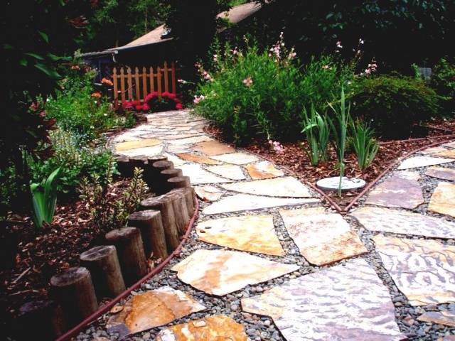 У другим случајевима се користе дрво и керамика. Када уређујете локацију, можете направити баштенске плочице сопственим рукама. Фрагменти стакла или мозаика стављају се у одговарајући контејнер, заливен бетоном. После очвршћавања извадите обрадак и положите га на земљу (можете га мало ископати ради стабилности). "Плочице" су направљене од различитих или исте величине. Иста "плочица" може се направити од дрвених блокова.
