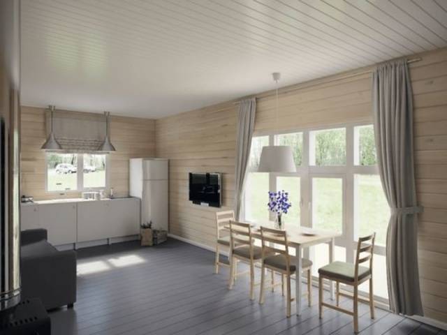 Овај дизајн ће се сигурно свидети љубитељима минимализма. Карактеристике стила су скромни декор, превладавање беле боје из унутрашњости сеоске куће, присуство широких прозорских отвора. За несметан приступ дневној светлости, завесе се не вешају на прозоре викендице (или се користе прозирна лагана платна од текстила). Шема боја унутрашњости садржи мутне нијансе сиве, смеђе, плаве боје.