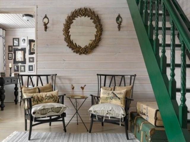 Главна карактеристика таквог ентеријера у земљи је природна мекоћа, одсуство претенциозног декора. Намештај је дрвени, украшен резбаријама. Стубиште ће такође бити освежено резбареним елементима (балустери, стубови). Било би органско користити старе производе у земљи. Препоручљиво је барем мало ажурирати намештај. Стару боју на намештају и степеницама треба ољуштити, површине брусити и поново фарбати. Пожељно је металне предмете очистити до сјаја.