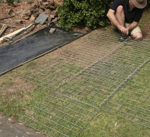 Након изравнавања шљунчане подлоге, све је прекривено црним филмом. Такође ће пригушити раст. коров кроз оквир габиона.