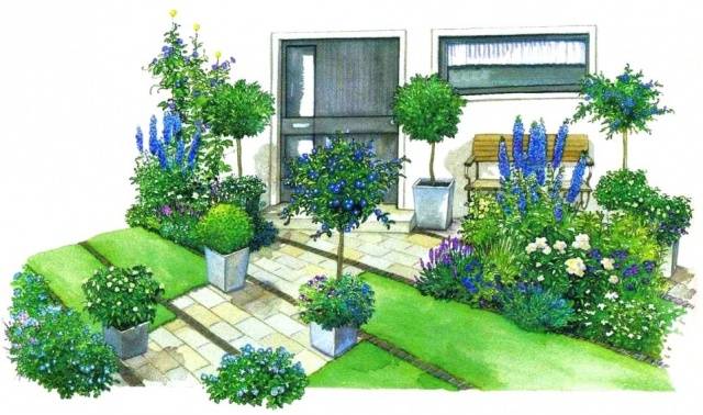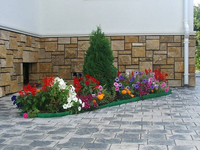 - Рабатка. Ако је предња башта испред куће правоугаона, онда се све цвеће / биљке могу садити у равномерним редовима.
