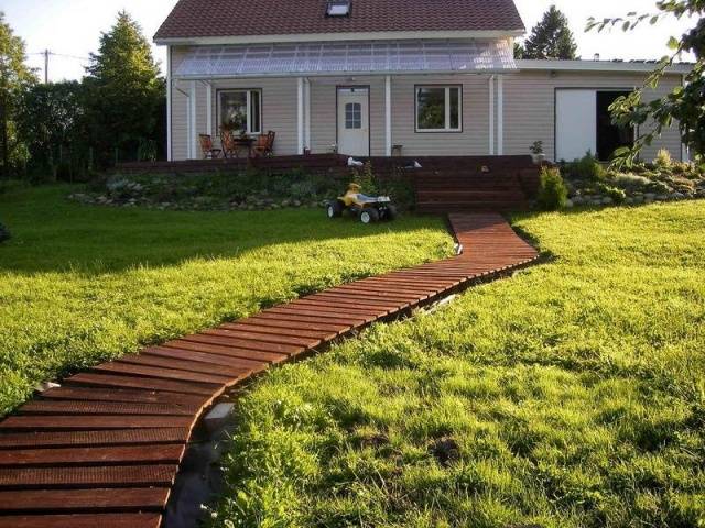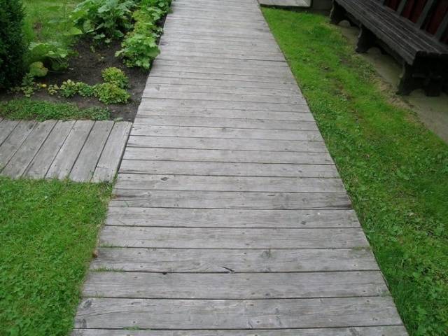 Дрво је доступан материјал. Баштенске стазе од дрвета израђују се помоћу различитих технологија. Баштенски покривач за кретање можете направити од дасака. Једноставно решење је куповина готове резане грађе, полагање плоча на блокове како би се смањио контакт дрвета са земљом. Цела конструкција положена је на подлогу од ломљеног камена. Дрвене плоче треба подићи изнад нивоа целе површине.