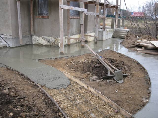 Бетон је јефтин материјал, издржљив и отпоран на механичка напрезања и неповољне временске услове. Животни век је дуг ако се поштује технологија припреме базе. Бетон даје простор за креативност. Можете добити другачију шему боја додавањем пигмента за бојење у раствор или сопственим рукама направити камење за поплочавање од бетонско-песковите смеше у земљи. Уградња бетонског платна захтеваће неко време и придржавање технологије како би се избегло пуцање у будућности.