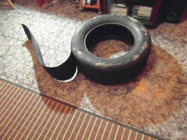 Придржавајући се мера предострожности приликом рада са оштрим ножем, врло пажљиво одвојите штитник за гуме са бочне стране. Одвојени заштитник појавит ће се у облику прстена. Даље, такође је потребно исећи да бисте добили траку. Ово ће бити припрема за будућу стазу.