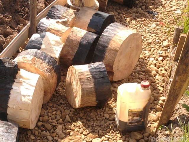 Размотрите јефтинију опцију за стварање стазе за летњу викендицу од резања дрвене тестере. Дакле, посекотине су потребне боље од тврдог дрвета висине до 30 цм. Дно третирајте битуменским мастиком.