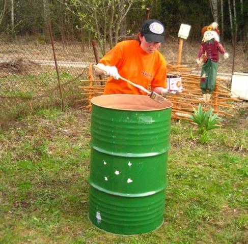 Боље је бачве обојити средством за бојење за одређени материјал. Ако је цев дрвена, користите дрвени емајл. Металне или пластичне посуде могу се трансформисати алкидним, уљним или воденим бојама са антикорозивним ефектом. Многи летњи становници бирају акрилне боје. Стварају живописан узорак, добро подносе временске аномалије, лако се наносе на површину и уклањају из руку и безбедни су за децу.