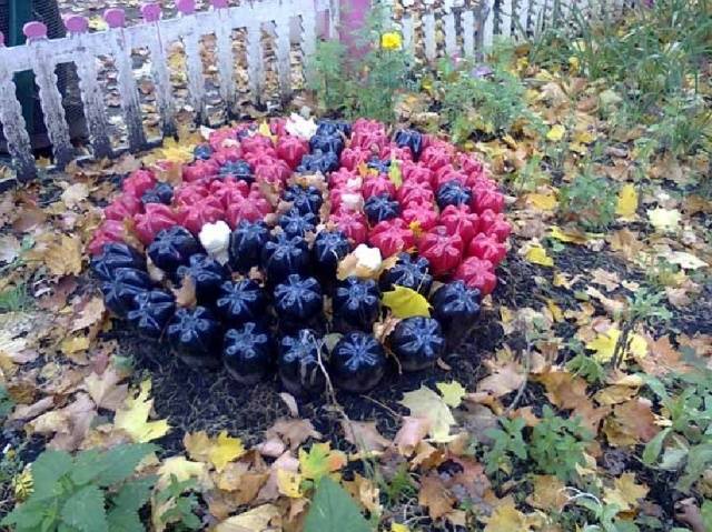 Веома важна карактеристика таквих заната је њихова водонепропусност. Не изгарају, не топе се на сунцу, не натапају се водом.Чак и од фрагмената можете створити ремек-дела која ће одушевити око. Пластичне боце су флексибилније и претворљиве. Талентовани мајстори израђују фигурице животиња, дрвеће (дланове), ограде за цветне кревете и кревете од флаша. Бојећи бочице у различите боје, свака украсима врта даје јединствени дизајн.