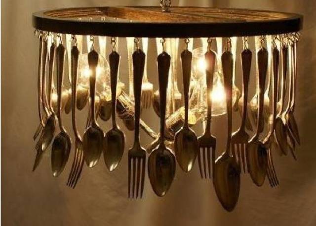 Занатлије са великим искуством могу да направе права ремек-дела. На фотографији је лустер од прибора за јело и стара лампа.