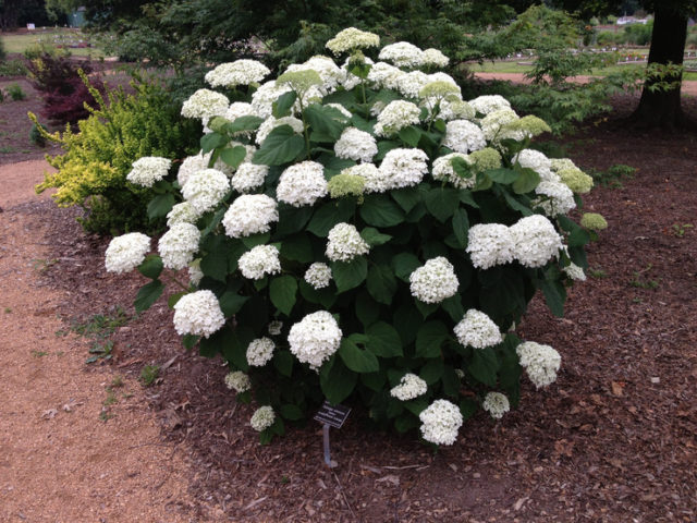 У врту је бела хортензија обично представљена дрвећем или метичастим сортама. У оба случаја биљка се у просеку уздиже 2-2,5 м изнад земље, има бројне танке изданке и зелене листове у облику срца. Листови биљке су обично велики, дужине до 15-20 цм.