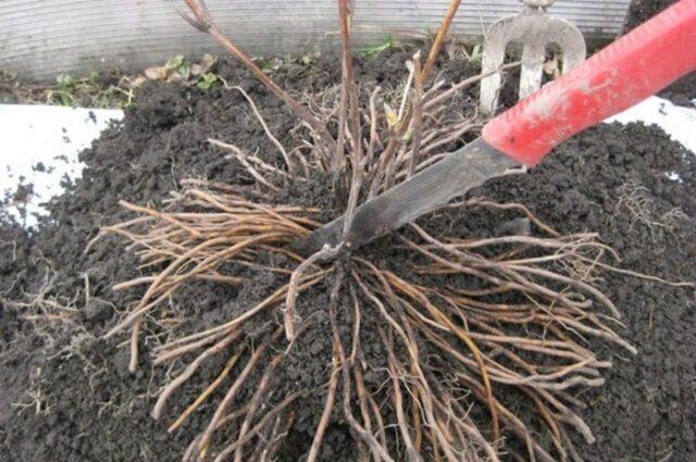 - Биљка за одрасле пажљиво се копа у круг и уклања заједно са земљаном грудом, покушавајући да не повреди корење.