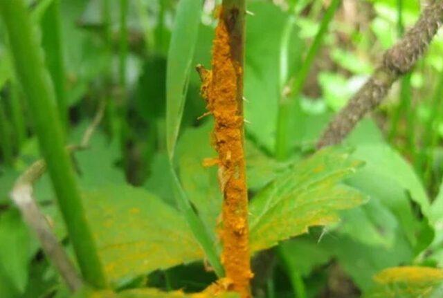 - рђа - пуцања грмља пуцају и згушњавају, на местима рана појављује се густи светлоцрвени цвет, листови су прекривени наранџастим мрљама;