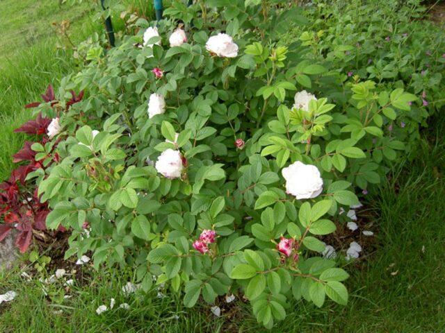 Истовремено, за грмље није потребно одабрати комшије са белим цветањем. Шипак ће се сјајно истицати на позадини црвених и ружичастих биљака. Његову лепоту повољно истичу тамнозелени простори.