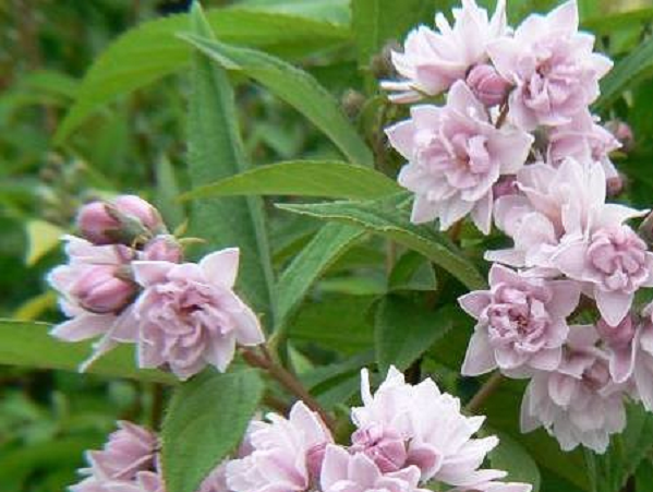 Зелени, распрострањени грм са дугим, текућим цватовима у облику венца, од којих се сваки састоји од двоструког периантха и пет зашиљених латица. Цветови су двосполни, мали, пречника око 2 цм, попут звона, немају арому. Латице су фротирне, изнутра беле, а споља ружичасте.