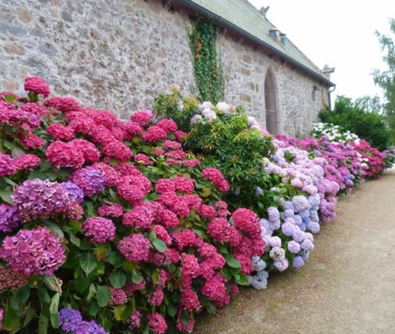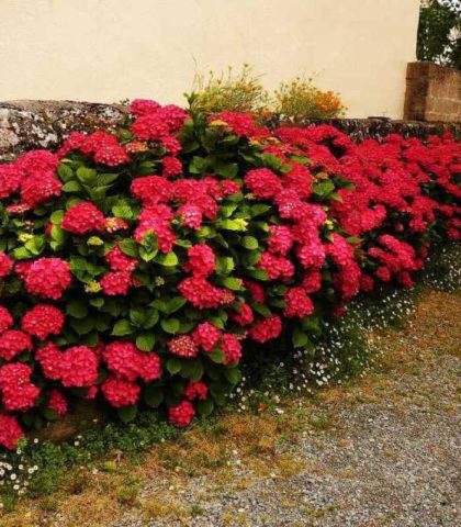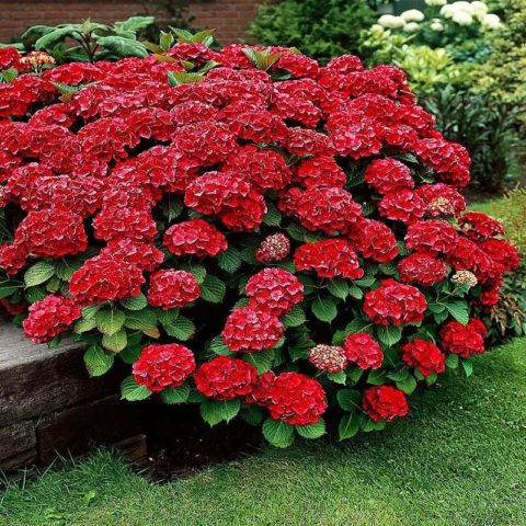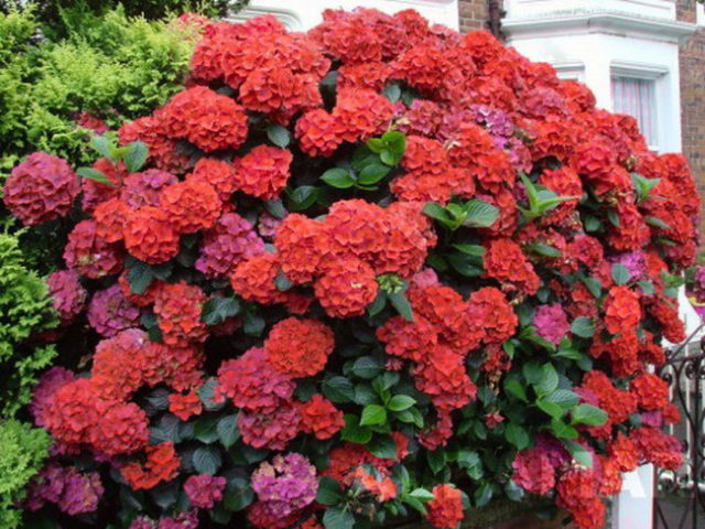 Захваљујући сферичном облику круне, врућа црвена хортензија је у стању да створи визуелну обману, проширујући простор око себе. Ово се често користи за повећање видљивих граница малих површина.