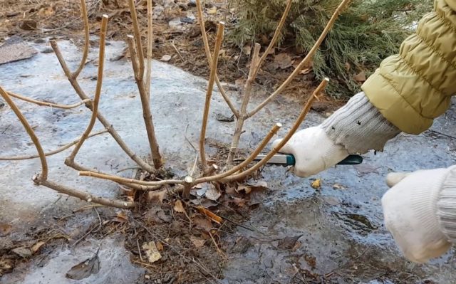 Затим се уклањају увеле или оштећене стабљике. Такође скраћују изданке који расту унутар круне, згушњавајући је. Снажне младе стабљике, на крајевима којих се у јесен формирају млади пупољци, не орезују се.