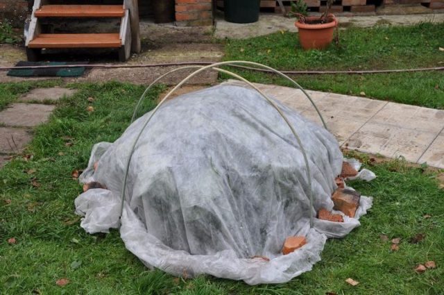 Ниско грмље до 1 м прекривено је тресетом, покривено филмом на врху, притискајући покривајући материјал даскама или спајалицама дуж ивица.