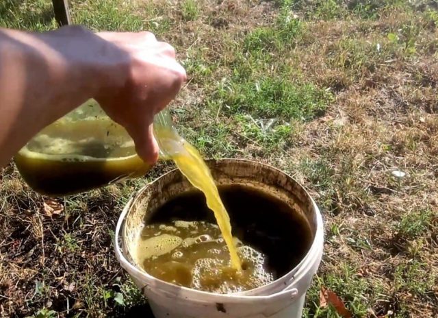 Истовремено, раствор крављег измета користи се као наводњавање храњивим материјама (литарска канта за канту воде)