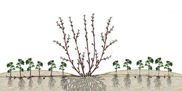 Други начин размножавања је да је у јесен неопходно одрезати доње гране грмља тако да на њима не остане више од два до четири пупољка. А затим поспите биљку плодним земљиштем до висине од 15-20 цм .Доласком пролећа, клице ће се појавити из пупољака који су остали. Када достигну висину од 10-15 цм, потребно је да их стиснете за 4-5 цм, поновите поступак неколико пута у сезони. У јесен одвојите сазреле саднице од матичног грма и пресадите на стално место.