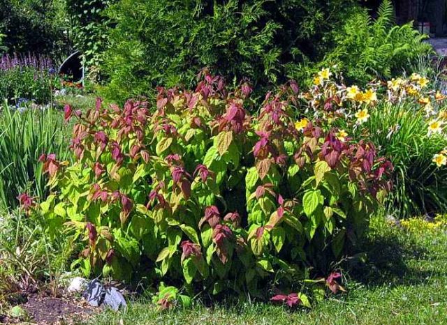 У пролеће лишће добија одређену црвенкасту нијансу, на јесен је златно-љубичасто. Постоји једна суптилност приликом обрезивања биљке. Када се одрасли грм исече на тлу, остављајући само 7-12 цм дебла, горње лишће растућих изданака биће обојено бордо-црвеним тоновима. После 3-4 године, периодично се сви изданци скраћују у априлу или мају на 30 цм изнад тла.