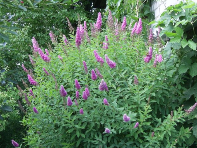 Кратки, до 1-1,2 м, грм ове врсте ливаде уске лишћа очарава белим и ружичастим метичастим цвастима, дужине до 20 цм, које цвети лети. Обрезивање врбове спирее је стандардно, као и за све летње цветне врсте - у априлу.