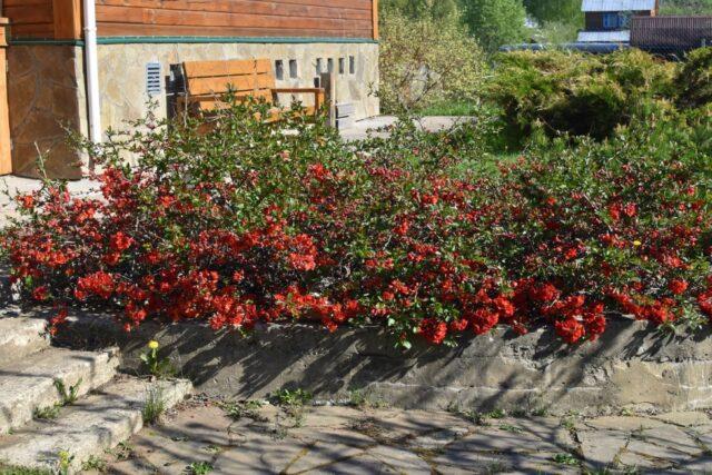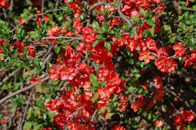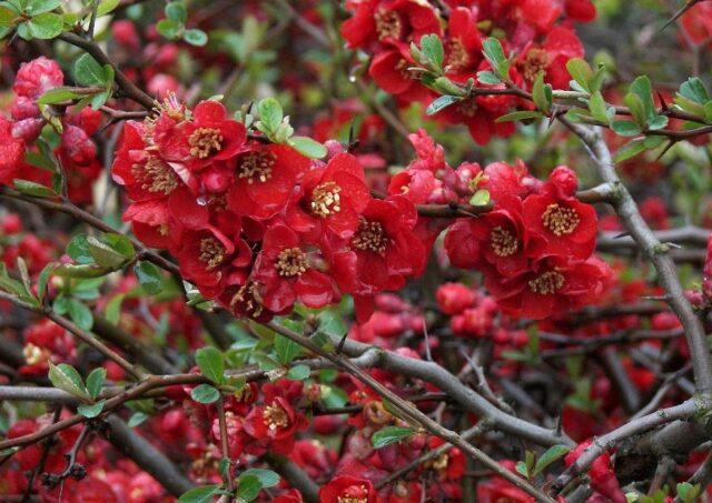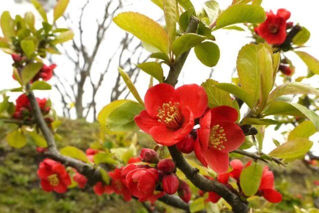 Црвени велики цветови на кратким педикелима појављују се на изданцима и пре него што се лишће отвори у другој или трећој деценији априла. Пупољци цветају постепено, па се процес одлаже месец дана.