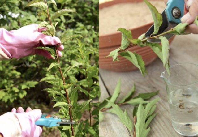 Резнице се беру средином јуна, када се завршава интензиван раст изданака.Дебеле дрвенасте гране се секу и деле на мање по 10 цм. Мале гранчице се на једном крају потапају у раствор воде са стимулатором раста на 12 сати. Затим су укорењени у мешавини тресета и песка (однос 1: 1). Да би се резнице брзо укорениле, неопходно је често заливање, најмање једном у 2 дана.
