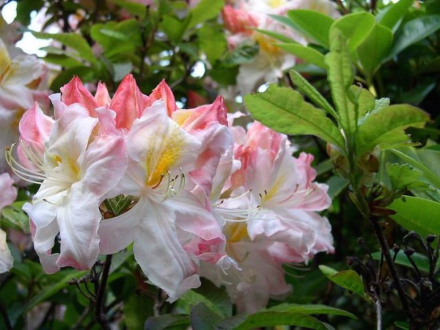- Рододендрон жути Силфиди... Грм висок 1 до 3 м. Крошња биљке је округла, листови су сјајни, зелени. Цвасти се састоје од 8 - 14 цветова, чије су латице бело-ружичасте боје са жутом мрљом, величине до 9 цм; Важно! Сорта Силфидес је једна од најотпорнијих сорти, може да издржи хладне температуре до -32 ° Ц.