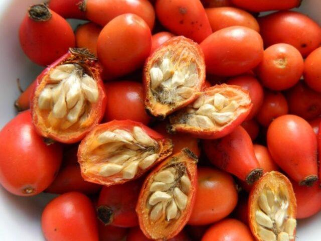 Плодови грмља су овални полисперми са сужењем на врху. Његова дужина је 1,5-4 цм, а пречник 0,8-2 цм. Површина је глатка, када сазри постаје светло црвена. Унутар плода су лагана, пубертетска семена. Њихова дужина достиже 4 мм, а ширина 3 мм. Маса 1000 семена је 8-9 г. Воће сазрева на грму крајем августа - почетком септембра.