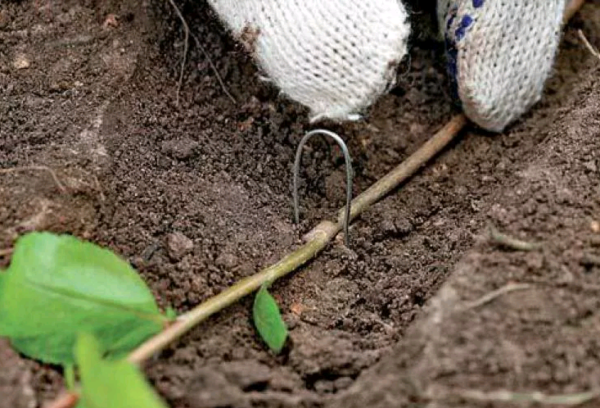 - Доњи, једногодишњи изданак се поставља у жлеб, остављајући врх изнад земље.