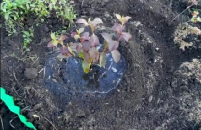 - Садница је постављена у средиште, прекривена хранљивим земљиштем, коријенски врат је остављен изнад површине (5 цм).