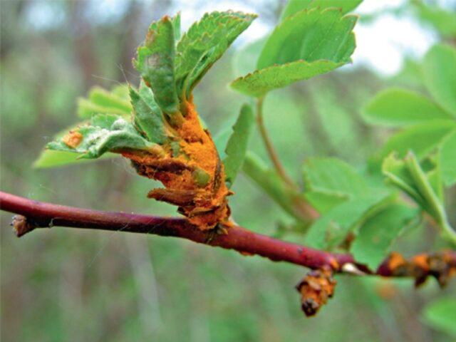 Захваћени изданци грма због болести су знатно задебљали и испуцали. Из отворених рана избија јарко црвени прашњави прах.