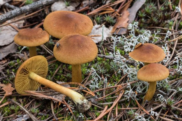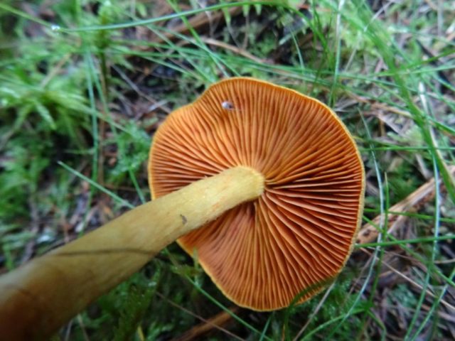 Гљива припада ламеларном одељку. Његове плоче су широке и честе, имају жуто-наранџасту нијансу у младим печуркама и зарђало-смеђу у старим, након сазревања спора. Плоче су за зуб причвршћене за педицу. Месо је жуто-смеђе, без мириса.