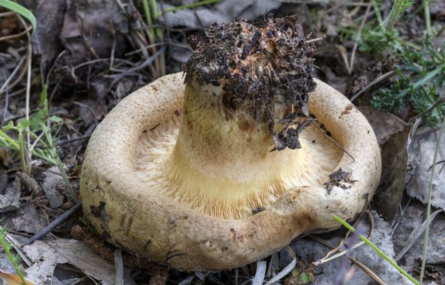 Према фотографији и опису, свињска печурка је помало попут млечне гљиве. Нога му је средње величине, дуга не више од 9 цм, а дебљина је око 2 цм. Нога има боју сличну капи.