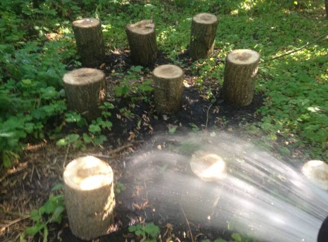 - Колона од конопље. Ова метода вам омогућава да узгајате велики број буковача на ограниченом подручју локације. Технологија укључује сечење једног дугачког дебла дрвета на неколико пањева, између којих се посипа мицелиј зрна. Састављајући пањеве поново у један пртљажник, шавови су повезани ноктима. Такав стуб пањева може бити висок до 2 м. Биће стабилан ако одаберете дрво великог пречника (више од 20 цм).